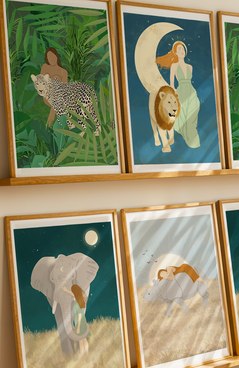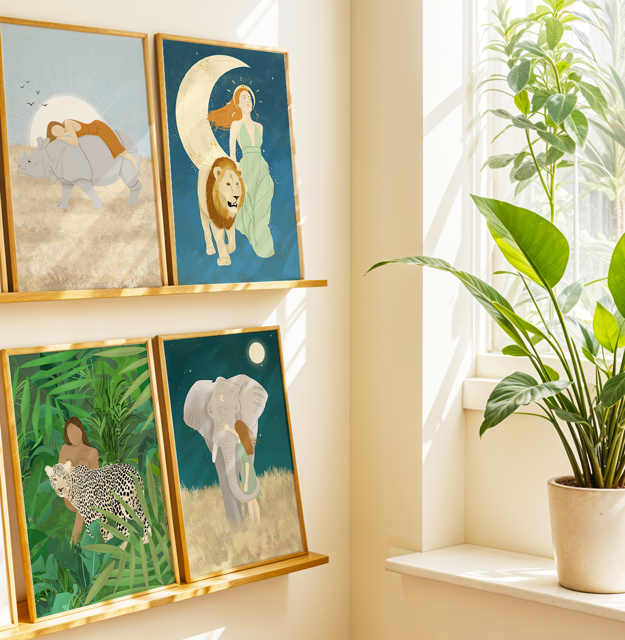 Im Herzen wild - das Set aus vier femininen Postern mit Illustrationen starker Frauen mit Tieren ermöglicht es dir, deiner wilde Seite in deinen eignen vier Wänden Ausdruck zu verleihen. Dabei ergeben sich viele individuelle Gestaltungsmöglichkeiten.