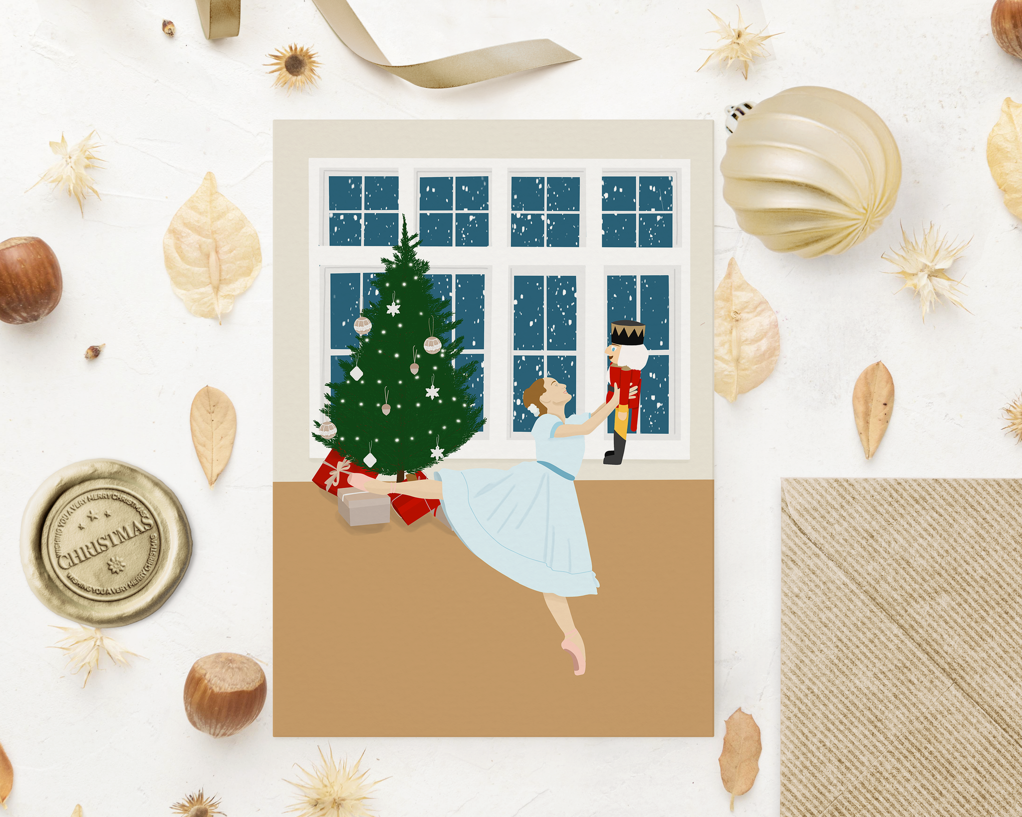 Diese liebevoll gestaltete Weihnachtskarte zeigt eine Ballerina aus dem zauberhaften Ballett „Der Nussknacker“ und richtet sich besonders an Tänzerinnen und Ballettliebhaber. Sie verbindet festliche Weihnachtsgrüße mit der Magie des Tanzes und eignet sich ideal, um persönliche Wünsche mit eleganter Note zu übermitteln.