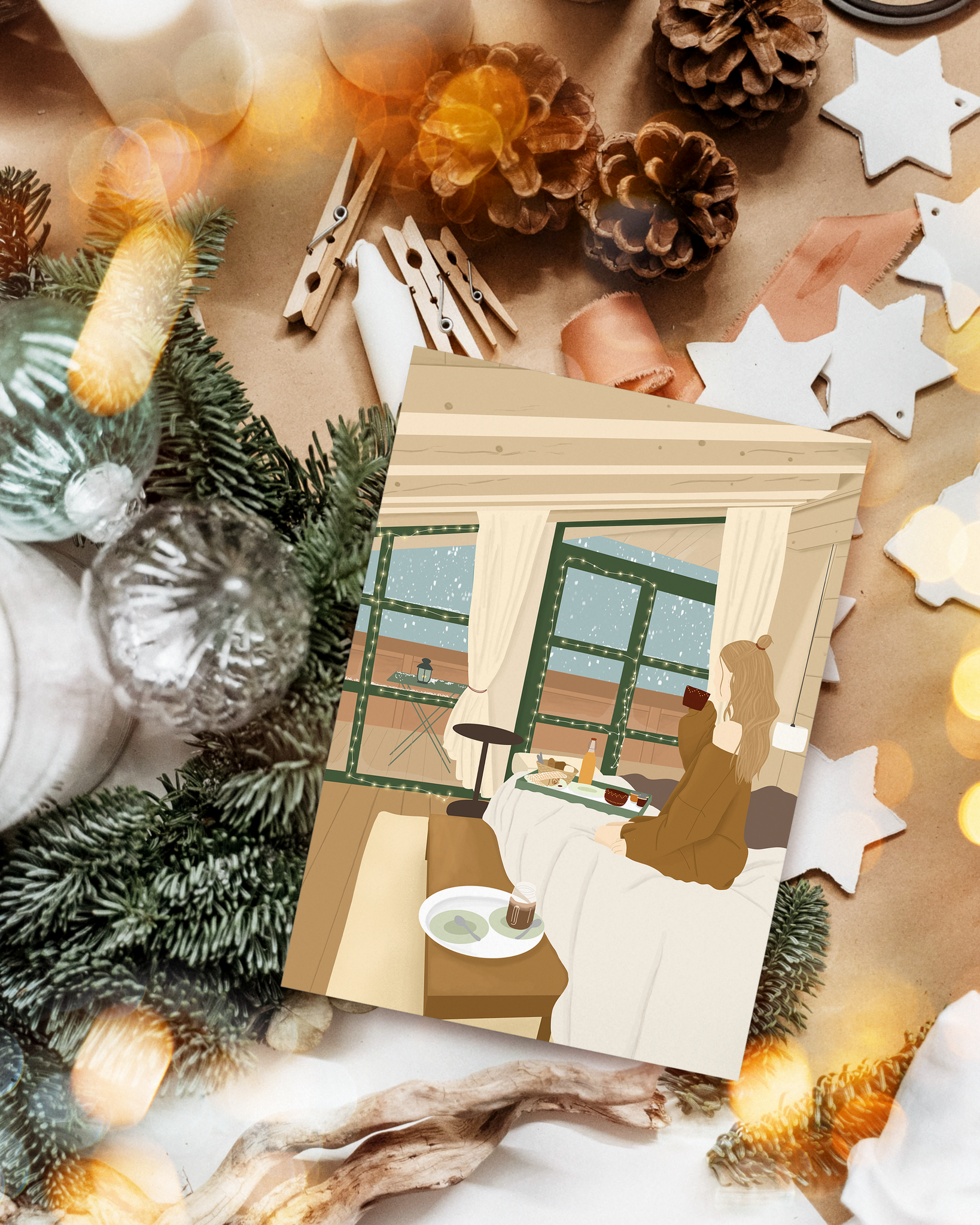 Die Weihnachtskarte mit Illustration eines gemütlichen Frühstücks Zuhause wurde handgemalt und für dich digitalisiert. Sie wird auf hochwertigem 300g Postkartenkarton seidenmatt gedruckt und ist auf der Rückseite beschreibbar. Auf der Rückseite befinden sich zudem vorgedruckte Adresszeilen und ein Feld für die Briefmarke. Du kannst selbst entscheiden, ob du die Postkarte allein oder die Postkarte mit zusätzlich passendem Kraftpapier Briefumschlag erhalten möchtest.