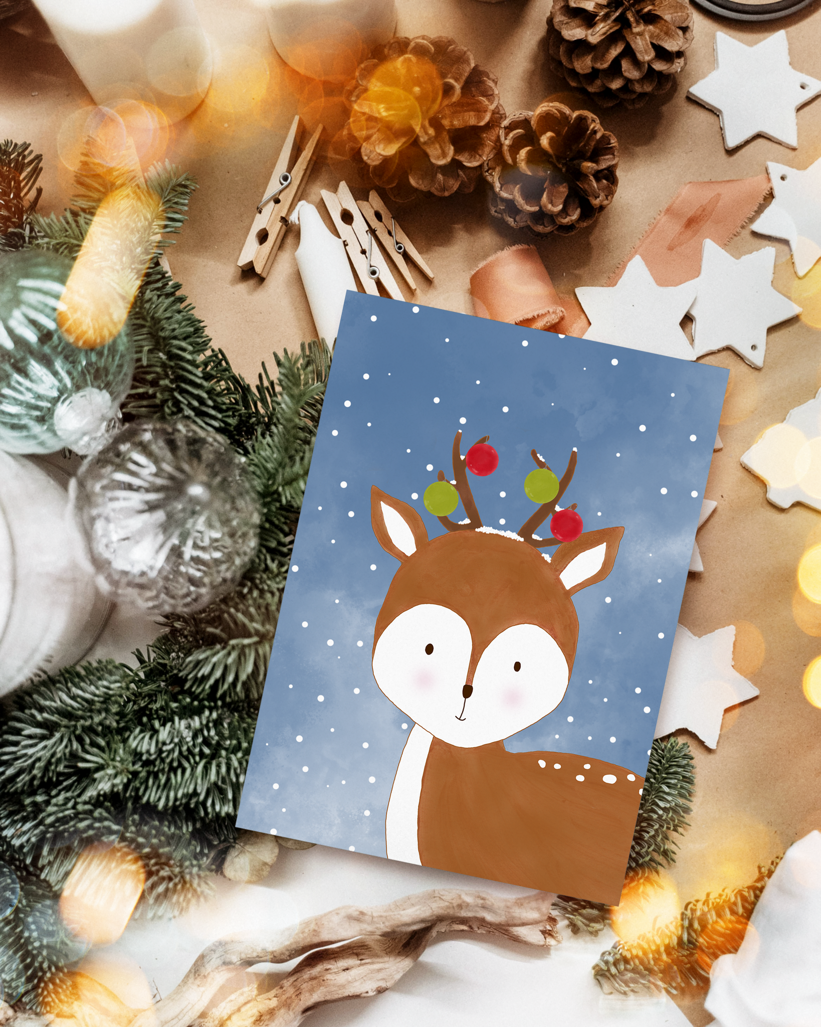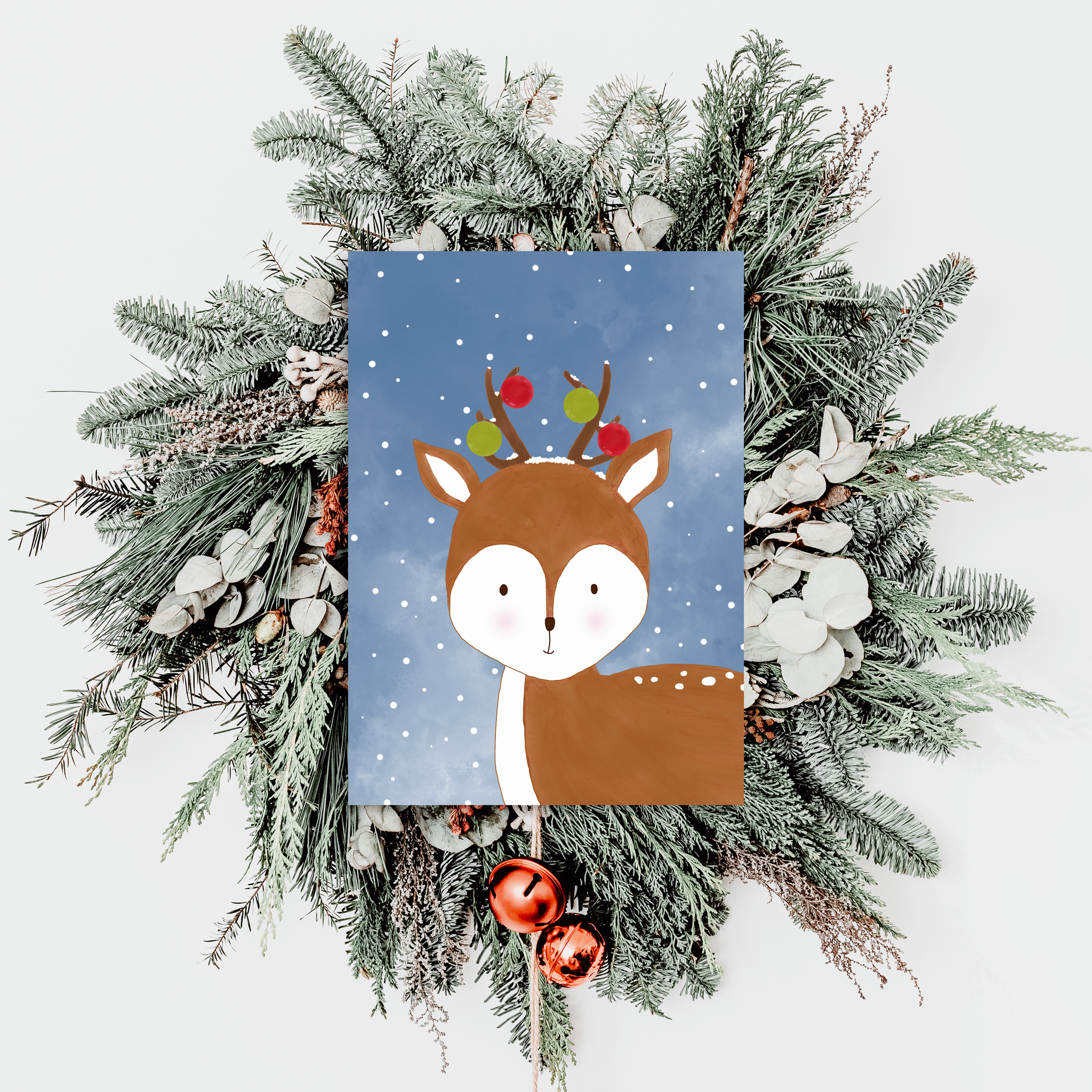 Diese Weihnachtskarte zeigt ein süßes Reh im Schnee und bringt eine niedliche, winterliche Atmosphäre in deine Festtagsgrüße. Das liebevolle Motiv eignet sich bestens, um deine Wünsche auf eine herzliche und persönliche Weise zu übermitteln und deinen Lieben eine Freude zu bereiten.