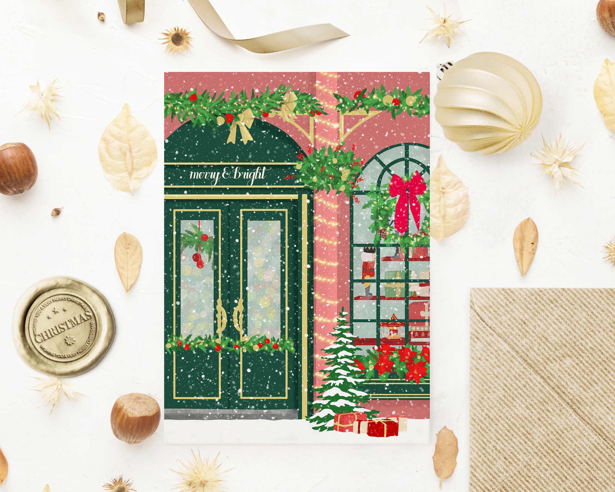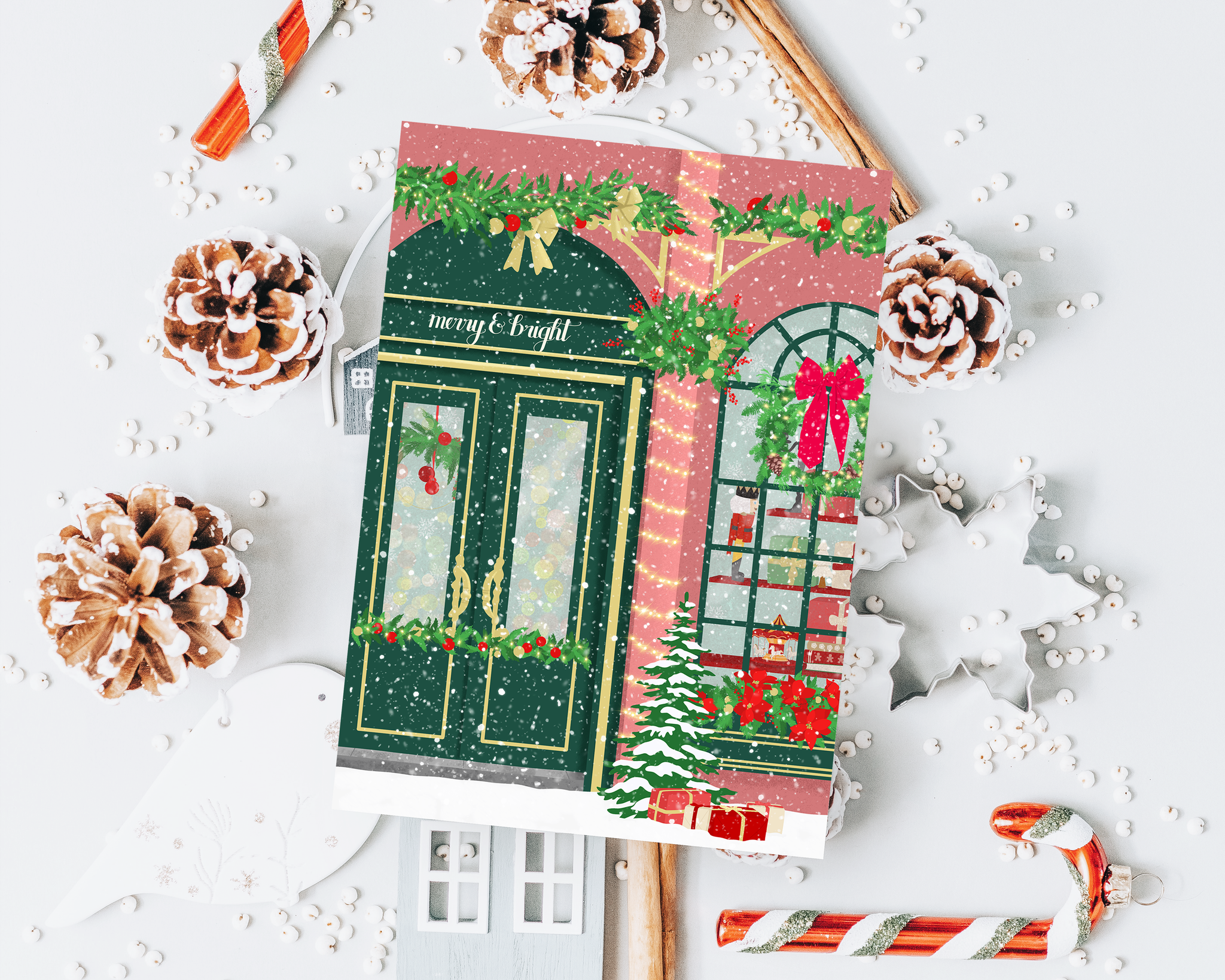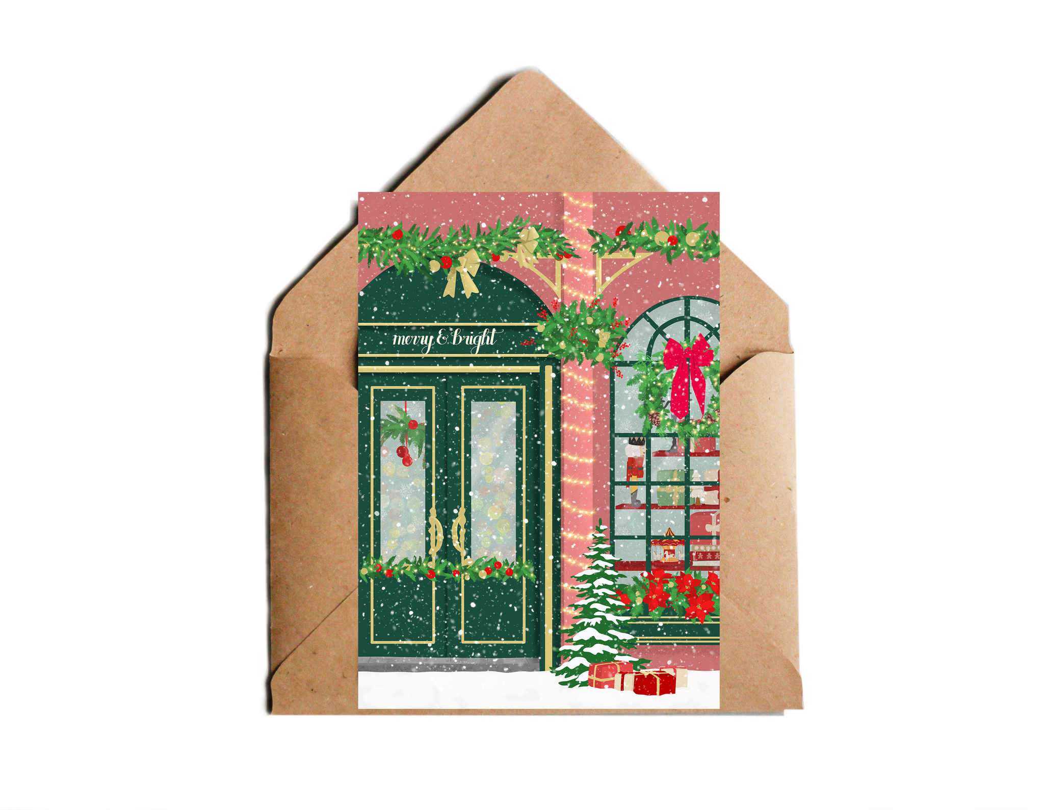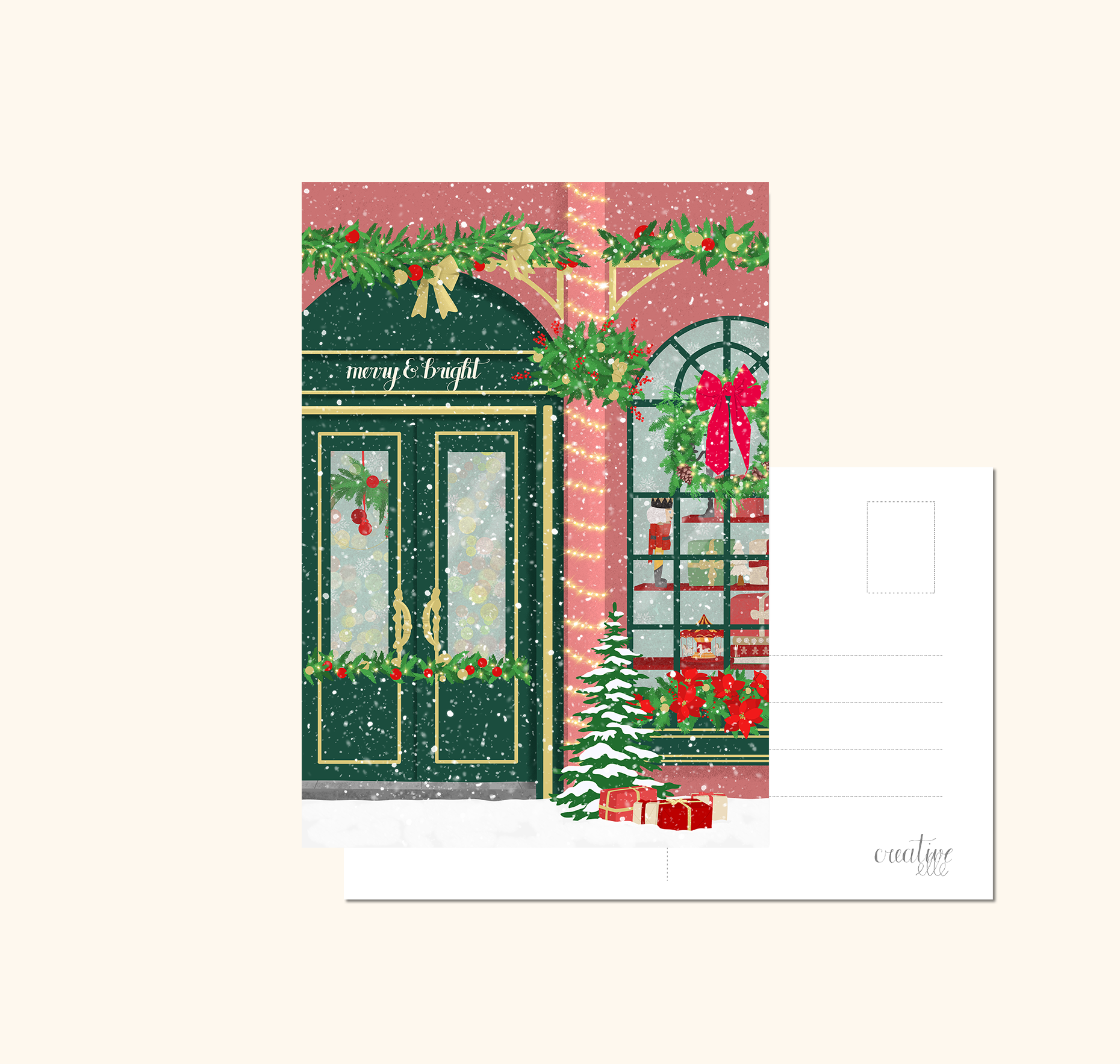 Diese klassische Weihnachtskarte zeigt eine liebevoll illustrierte Szene eines festlich geschmückten Weihnachtsladens. Mit der detailreichen Gestaltung bringt die Karte gemütliche Weihnachtsstimmung direkt zu deinen Lieben. Ideal, um persönliche Wünsche auf besondere Weise zu übermitteln und das Fest in ein stimmungsvolles Licht zu tauchen.