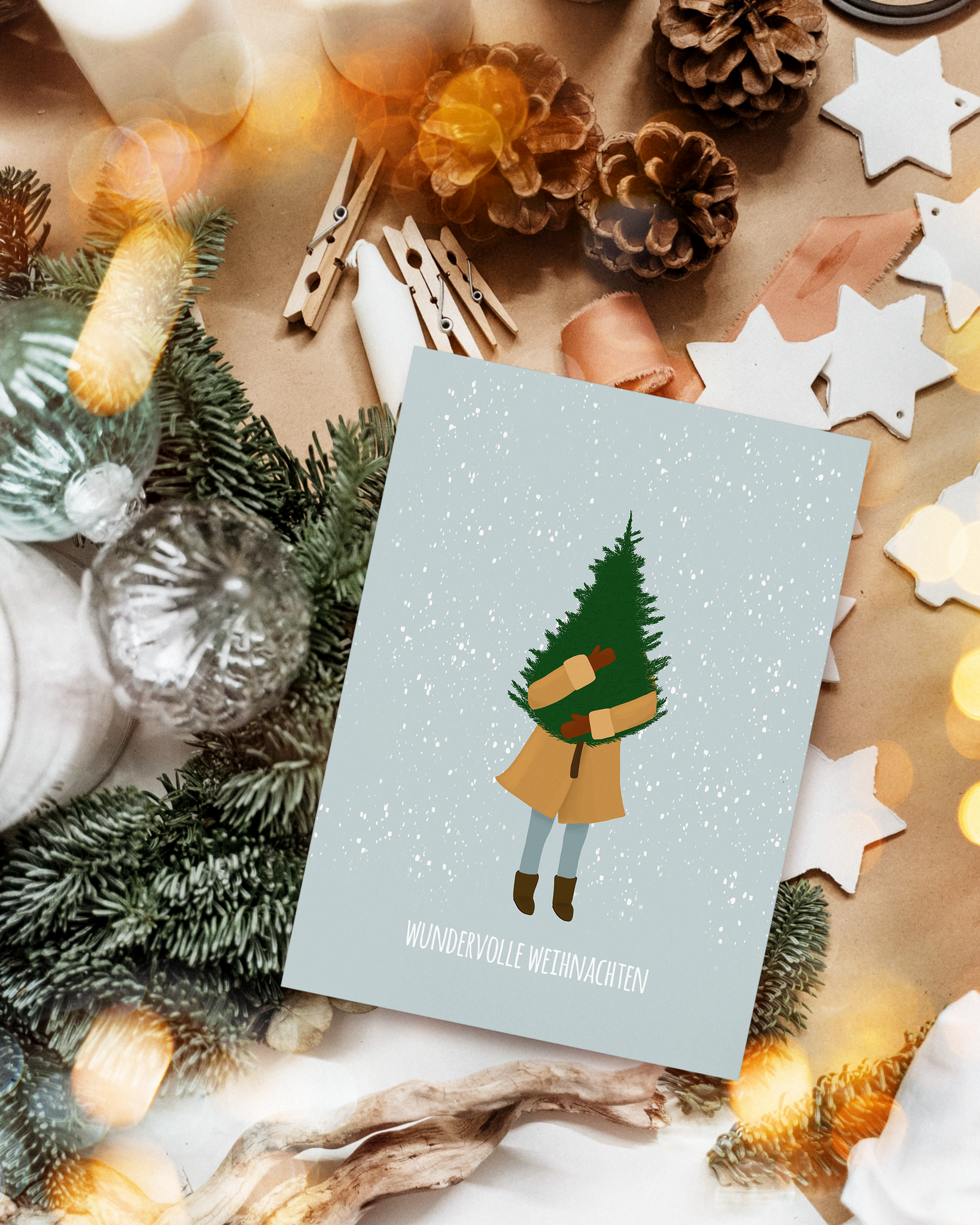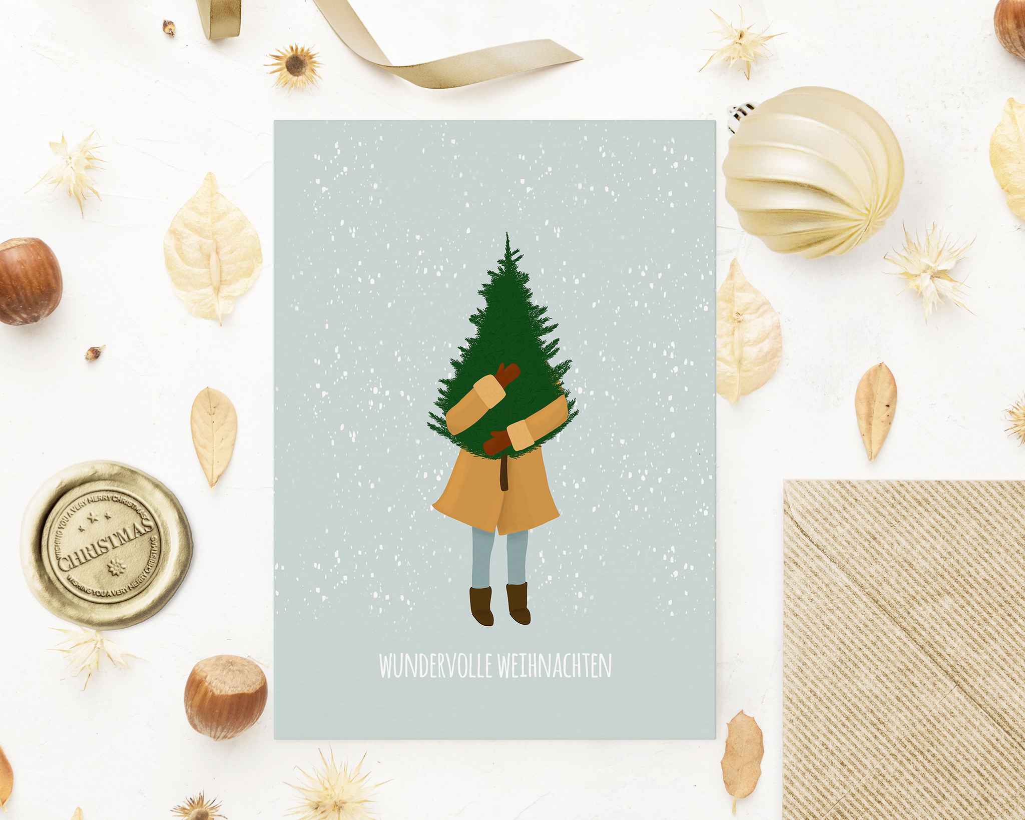 Die moderne Weihnachtskarte mit Illustration einer Tanne tragenden Frau und Schriftzug wundervolle Weihnachten wurde handgemalt und für dich digitalisiert. Sie wird auf hochwertigem 300g Postkartenkarton seidenmatt gedruckt und ist auf der Rückseite beschreibbar. Auf der Rückseite befinden sich zudem vorgedruckte Adresszeilen und ein Feld für die Briefmarke. Du kannst selbst entscheiden, ob du die Postkarte allein oder die Postkarte mit zusätzlich passendem Kraftpapier Briefumschlag erhalten möchtest.