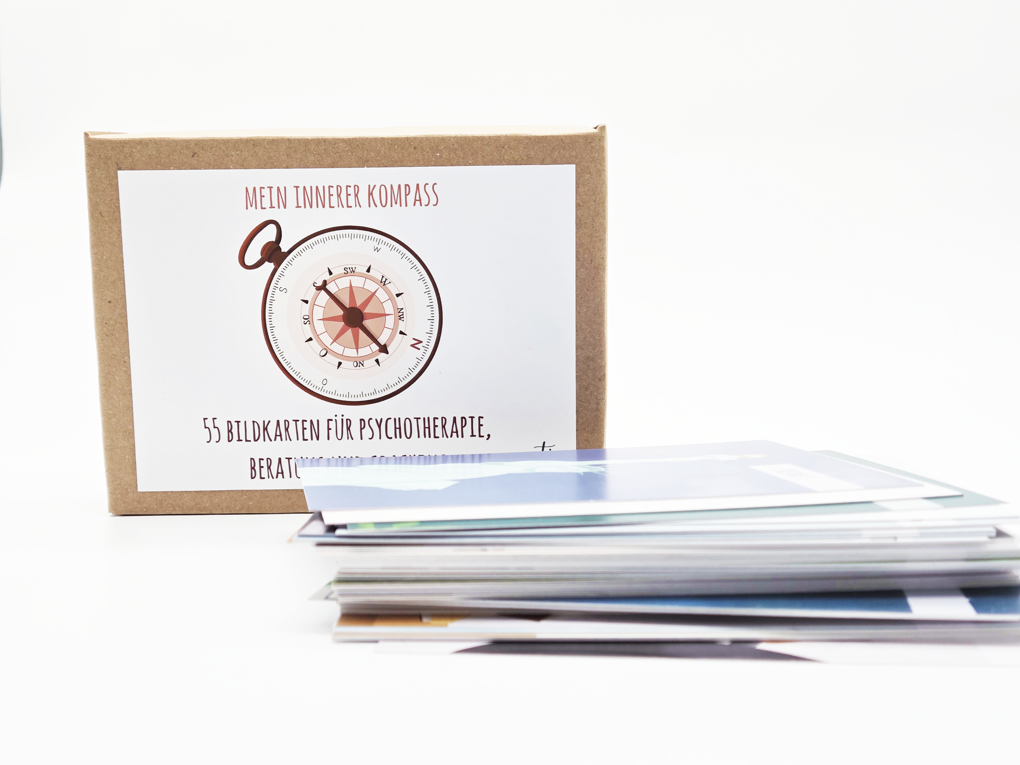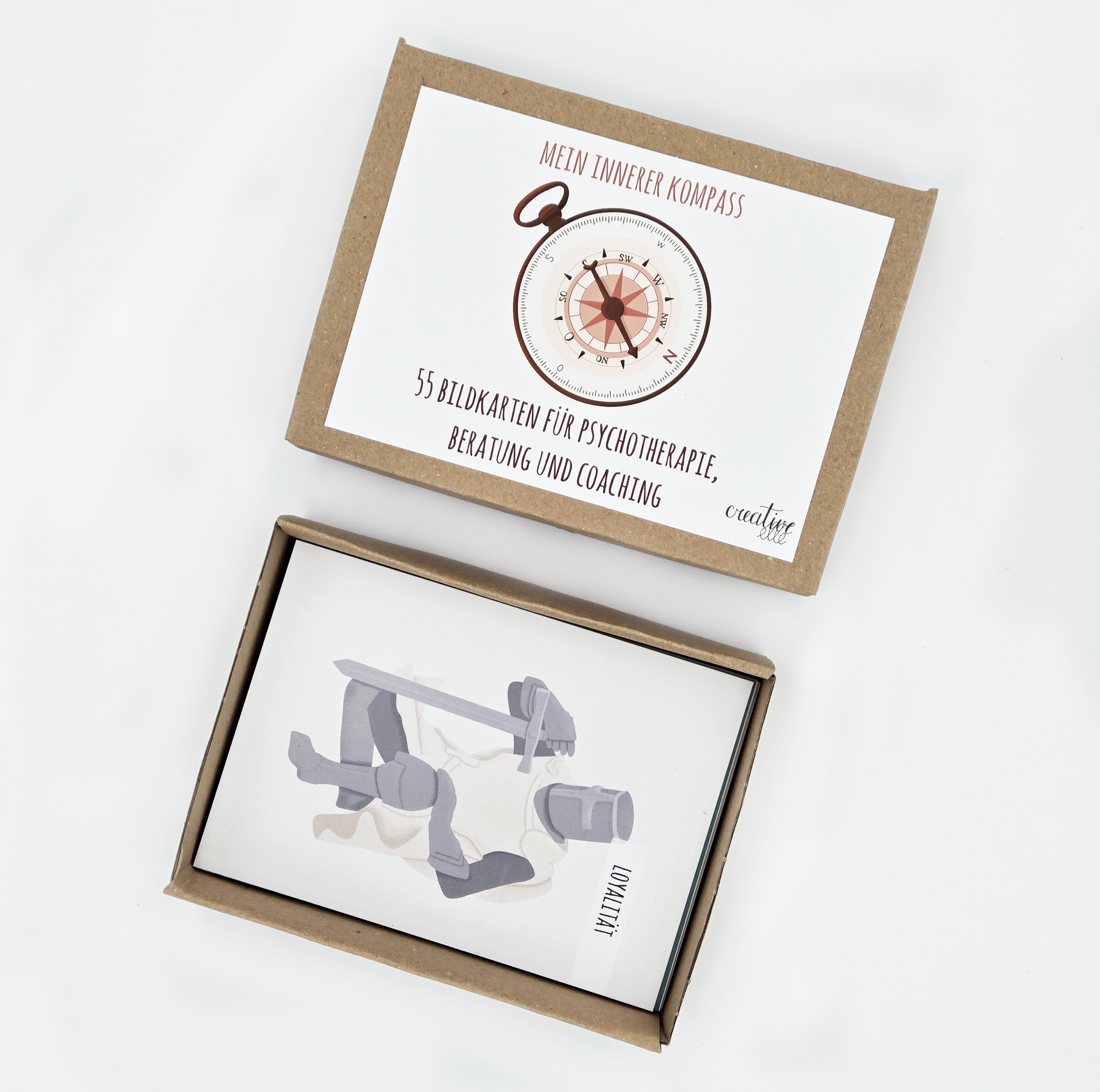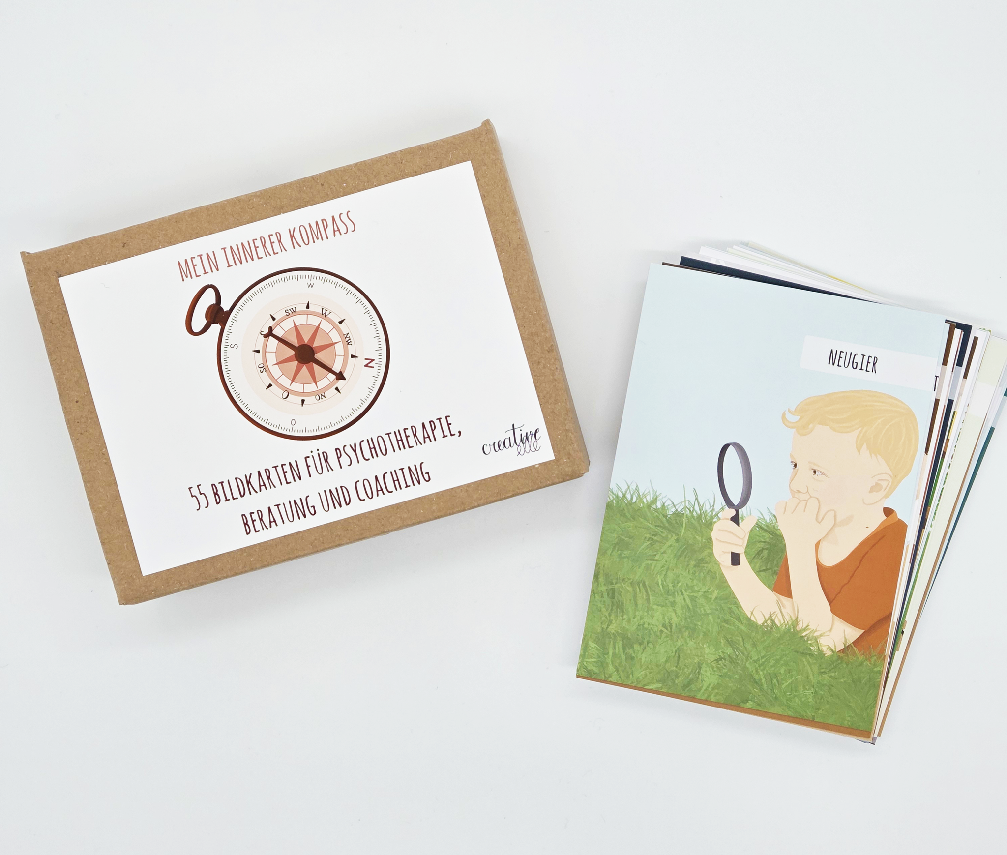 Das Therapiekartenset enthält 55 illustrierte Wertekarten in der Größe A6, die verschiedene Themenbereiche abdecken und in einer stabilen Pappschachtel geliefert werden, die sich zur langfristigen Aufbewahrung eignet. Die Karten werden auf hochwertigem 400g Postkartenkarton matt gedruckt und sind auf der Rückseite blanko.