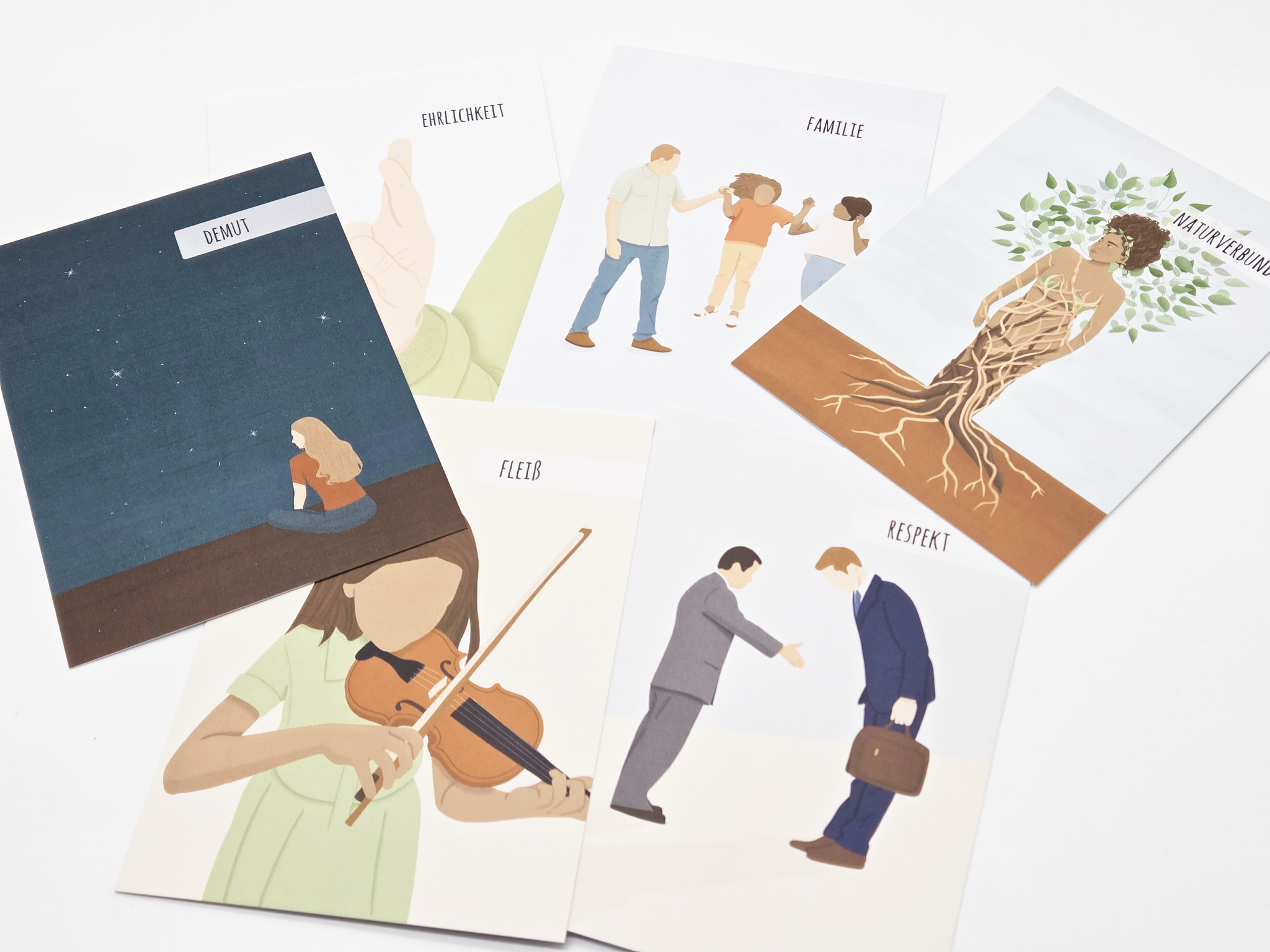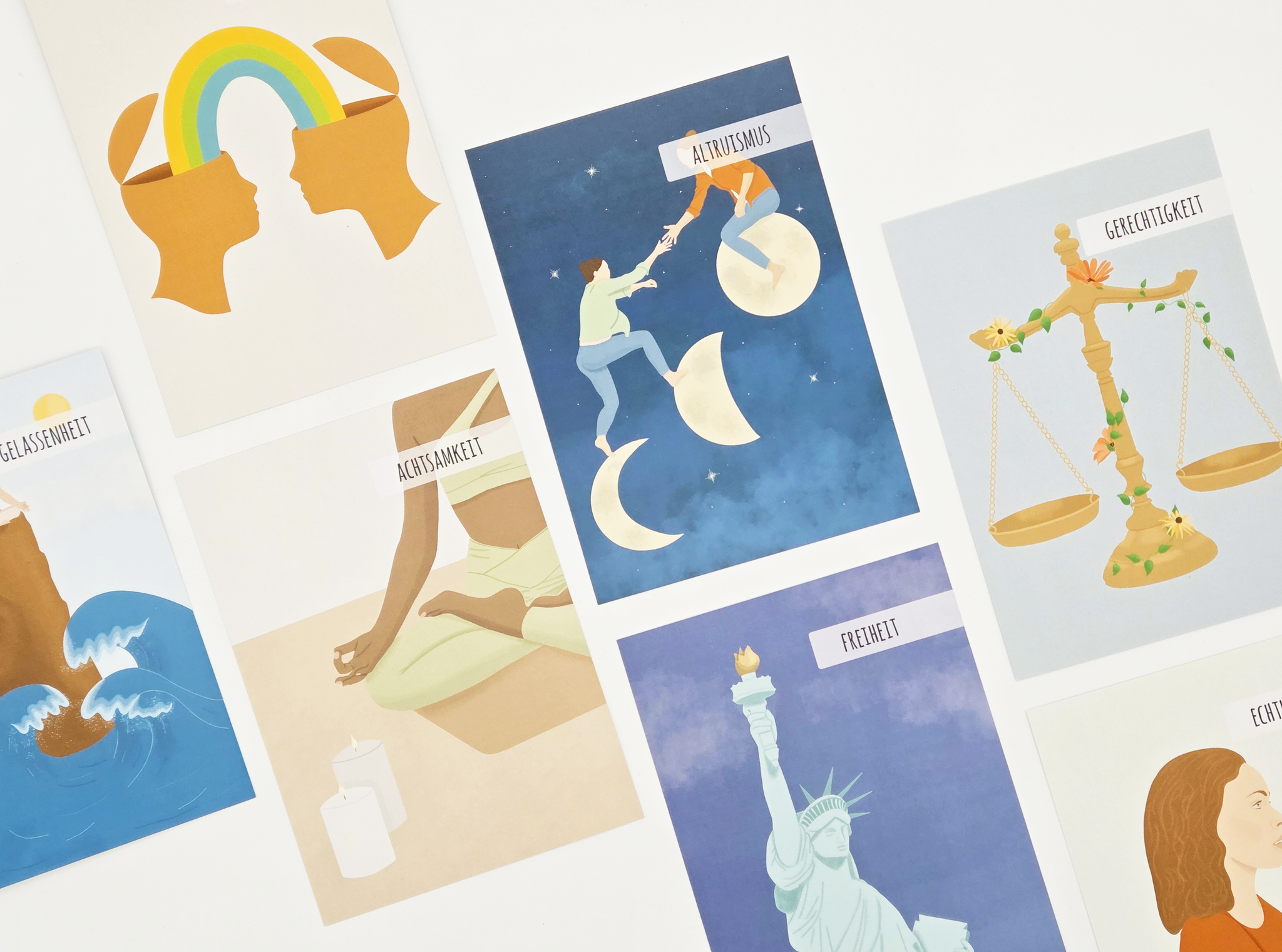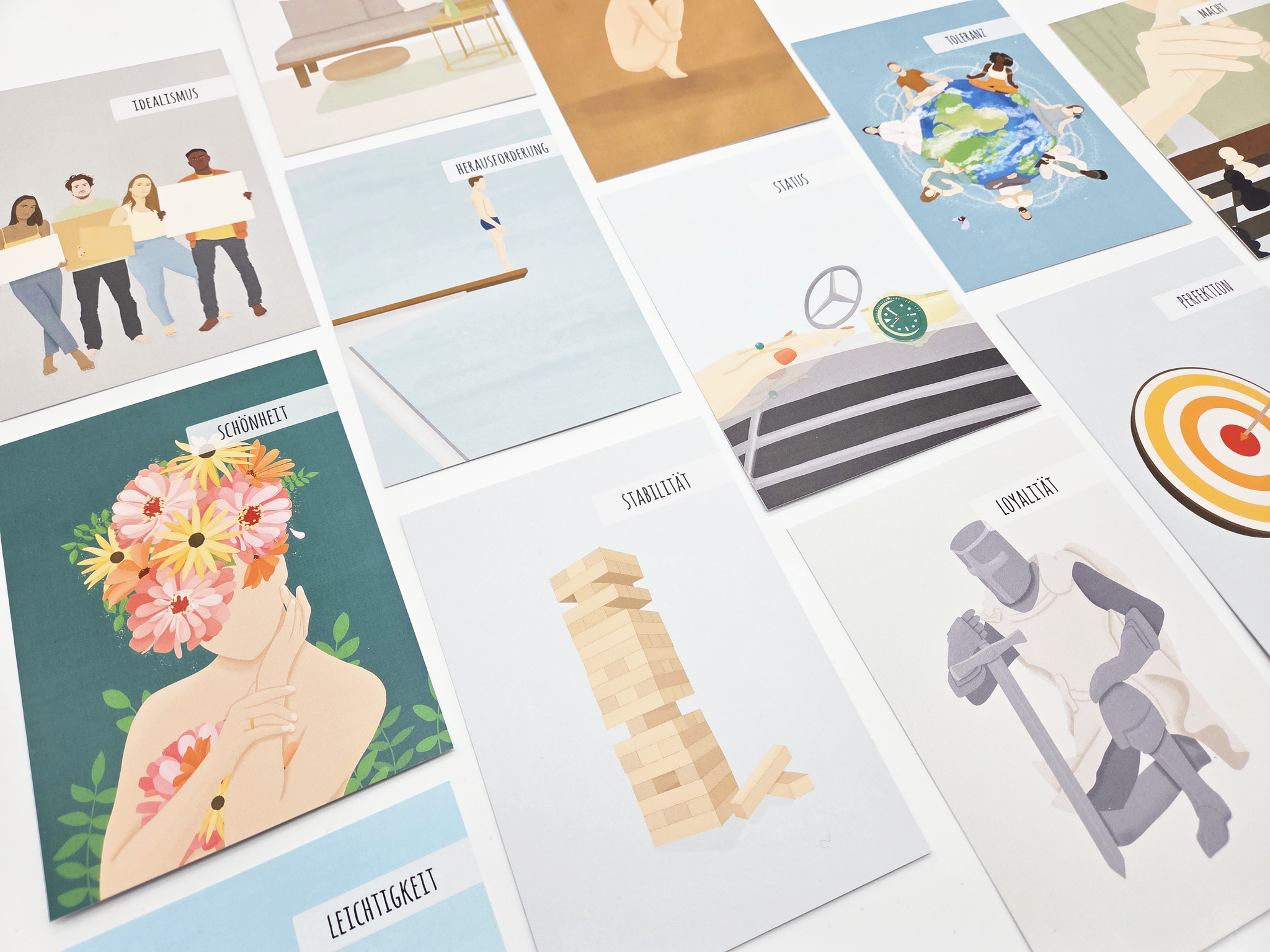 Die sorgfältigen Illustrationen der Wertekarten helfen nicht nur beim Verständnis, sondern schaffen zusätzlich einen visuellen Anker, der die eigenen Werte auch in schwierigen Situationen erinnerbar macht.