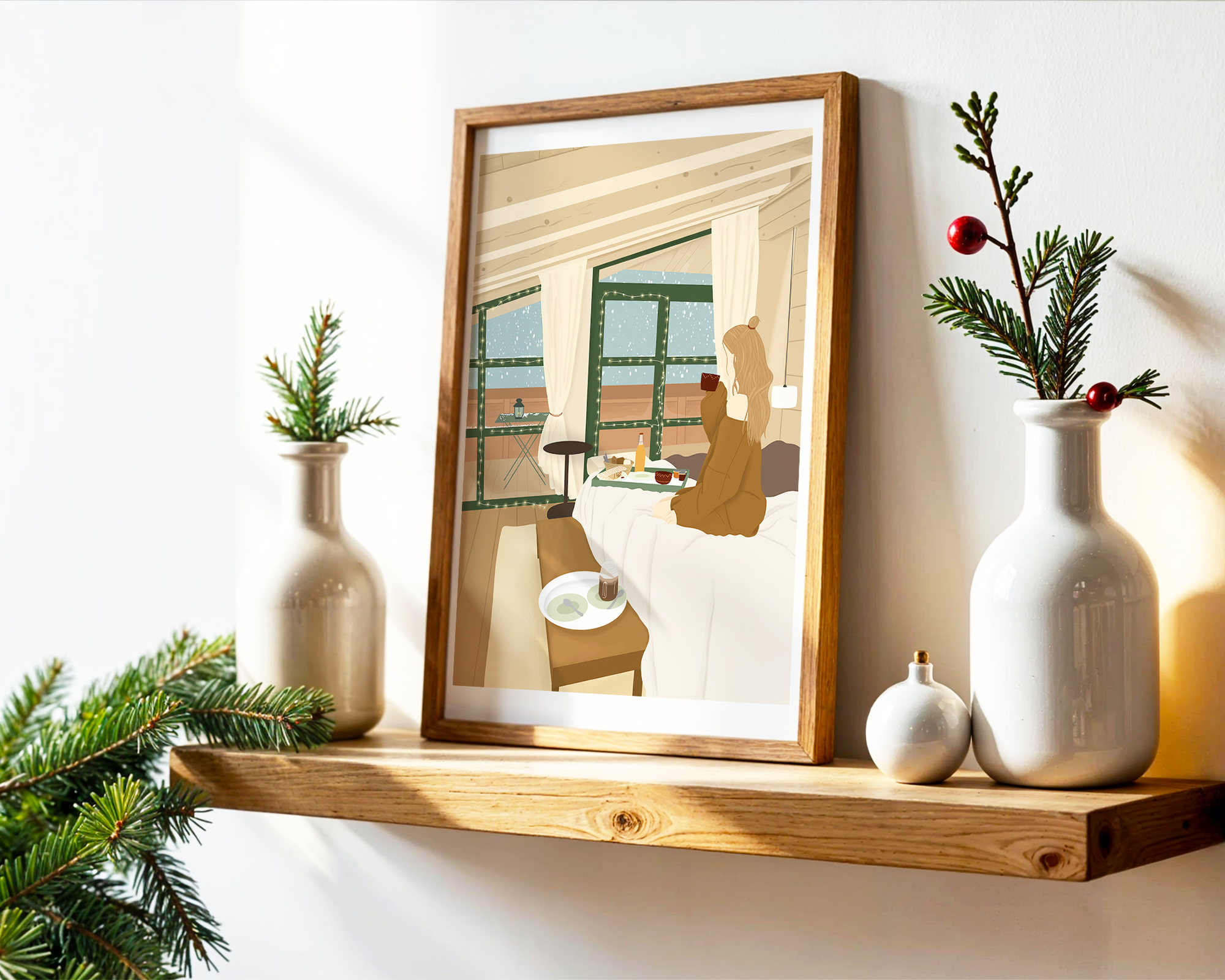 Tauche ein in die Wärme eines verschneiten Wintermorgens mit diesem charmanten Kunstdruck. Die Illustration zeigt ein gemütliches Frühstück in einer Holzhütte – dampfender Kaffee, frische Brötchen und der Blick auf den verschneiten Himmel. Dieses Poster bringt hygge-Gefühle in Ihr Zuhause und schafft eine einladende Atmosphäre in Wohnzimmer, Küche oder Schlafzimmer.
